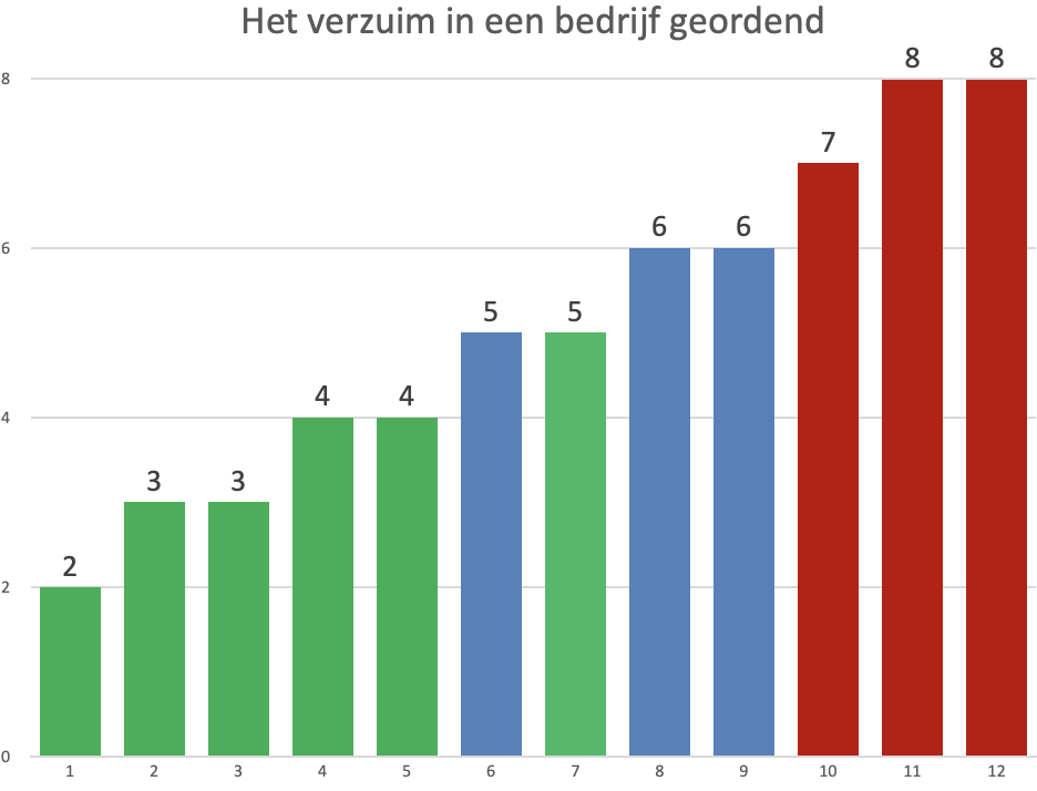Afbeelding 1 geeft aan hoe hoog het verzuimpercentage is op 12 afdelingen binnen een bedrijf. Als we deze afdelingen van een laag verzuimpercentage naar een hoog verzuimpercentage gaan plaatsen dan volgt afbeelding 2.